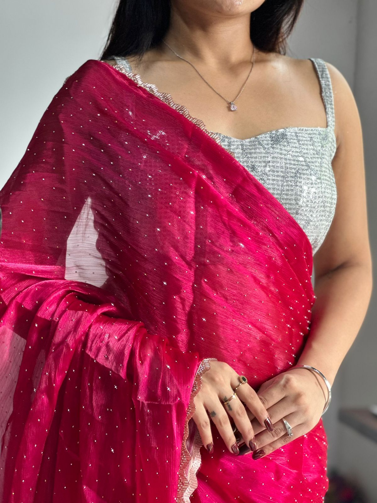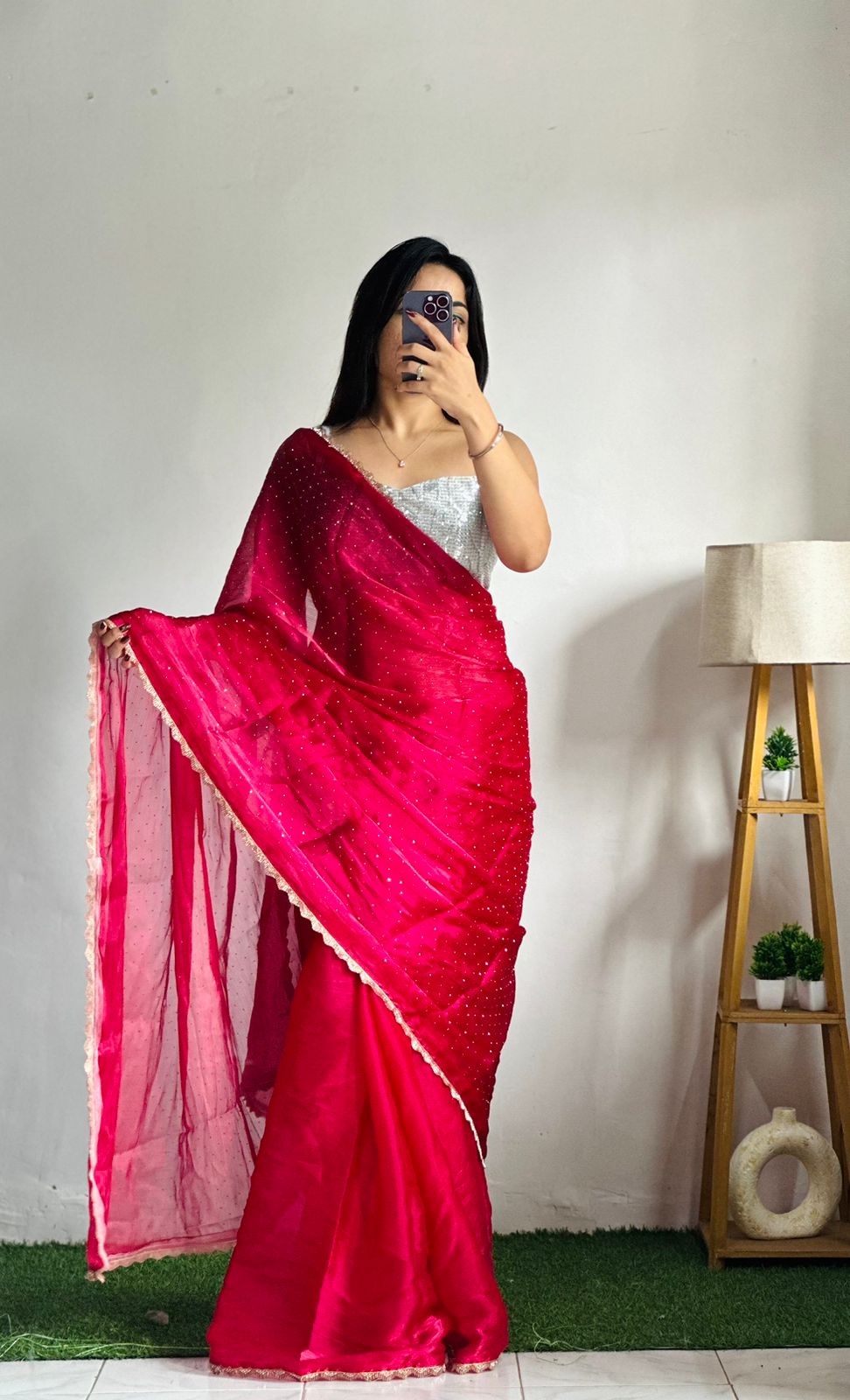Heavy jimmy shimmer saree with complete diamond work all over and heavy hand work border with in pearl